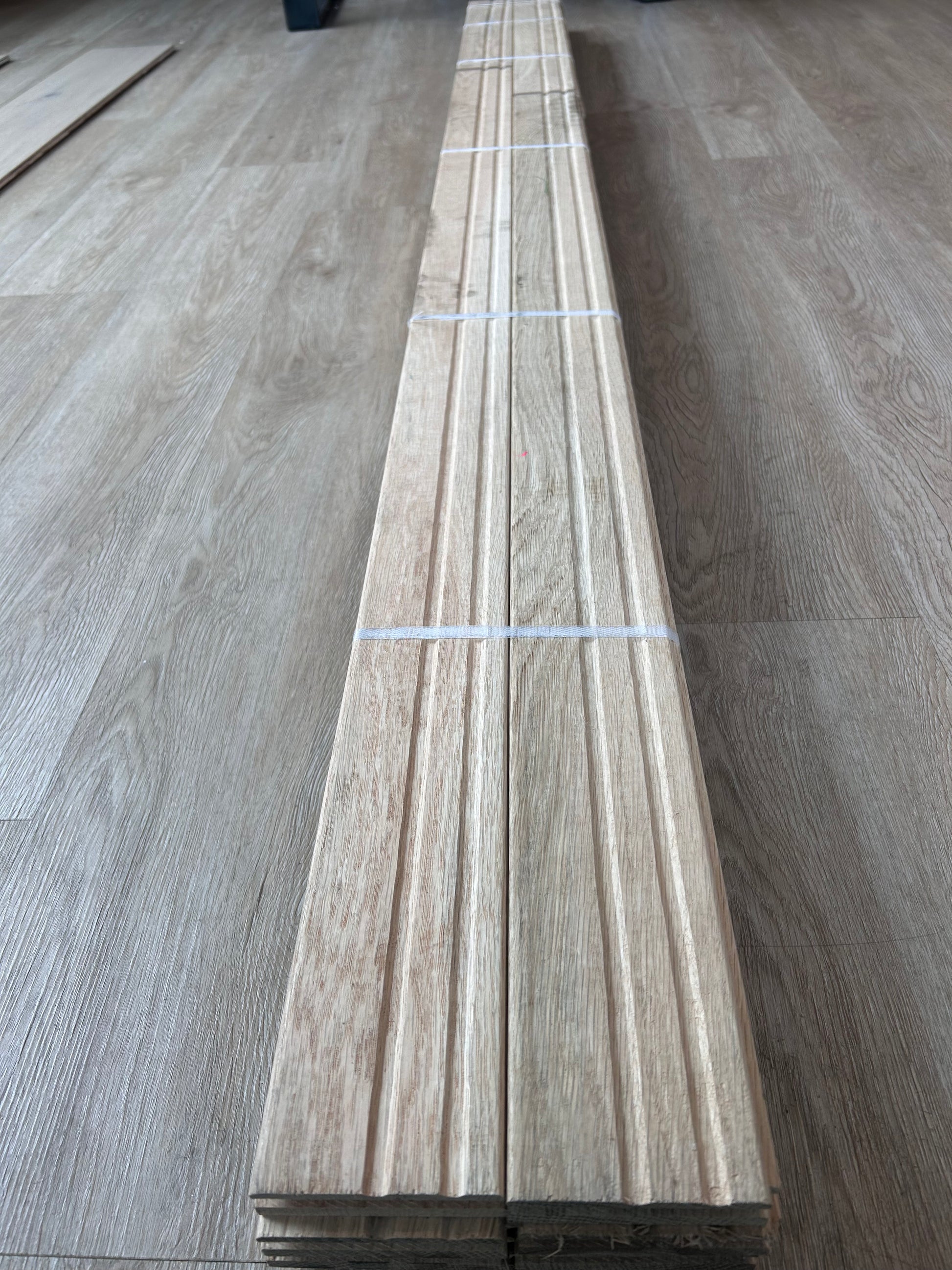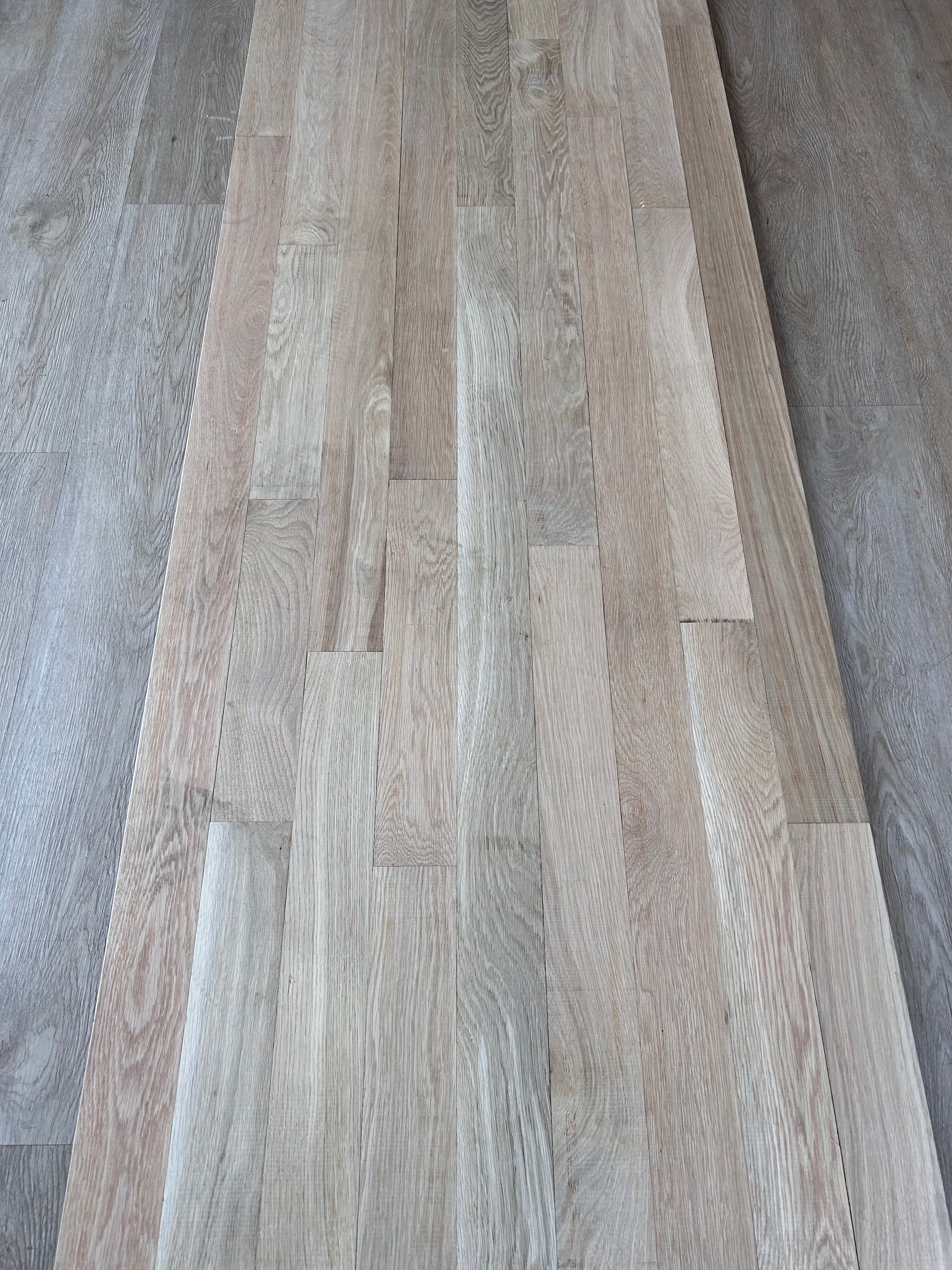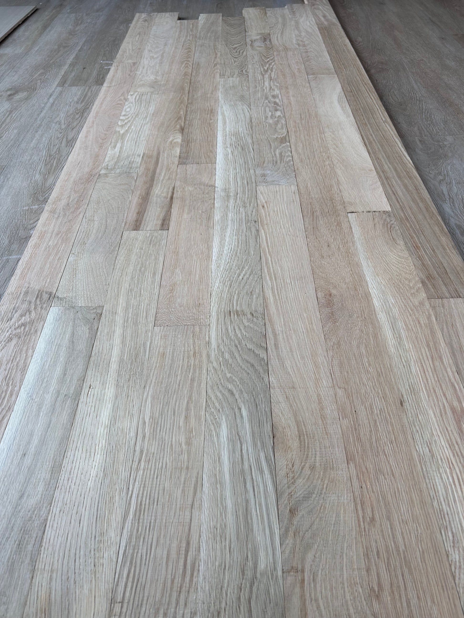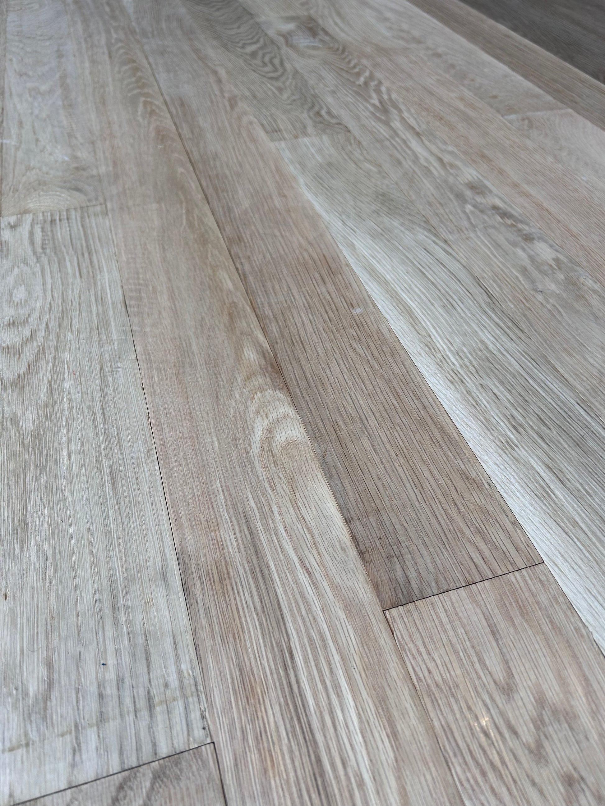 This floor is an unfinished product and must be sanded and finished after installation. The pictures and definition we provided were taken by the manufacturer of the installed product, and an actual bundle of material from our inventory.