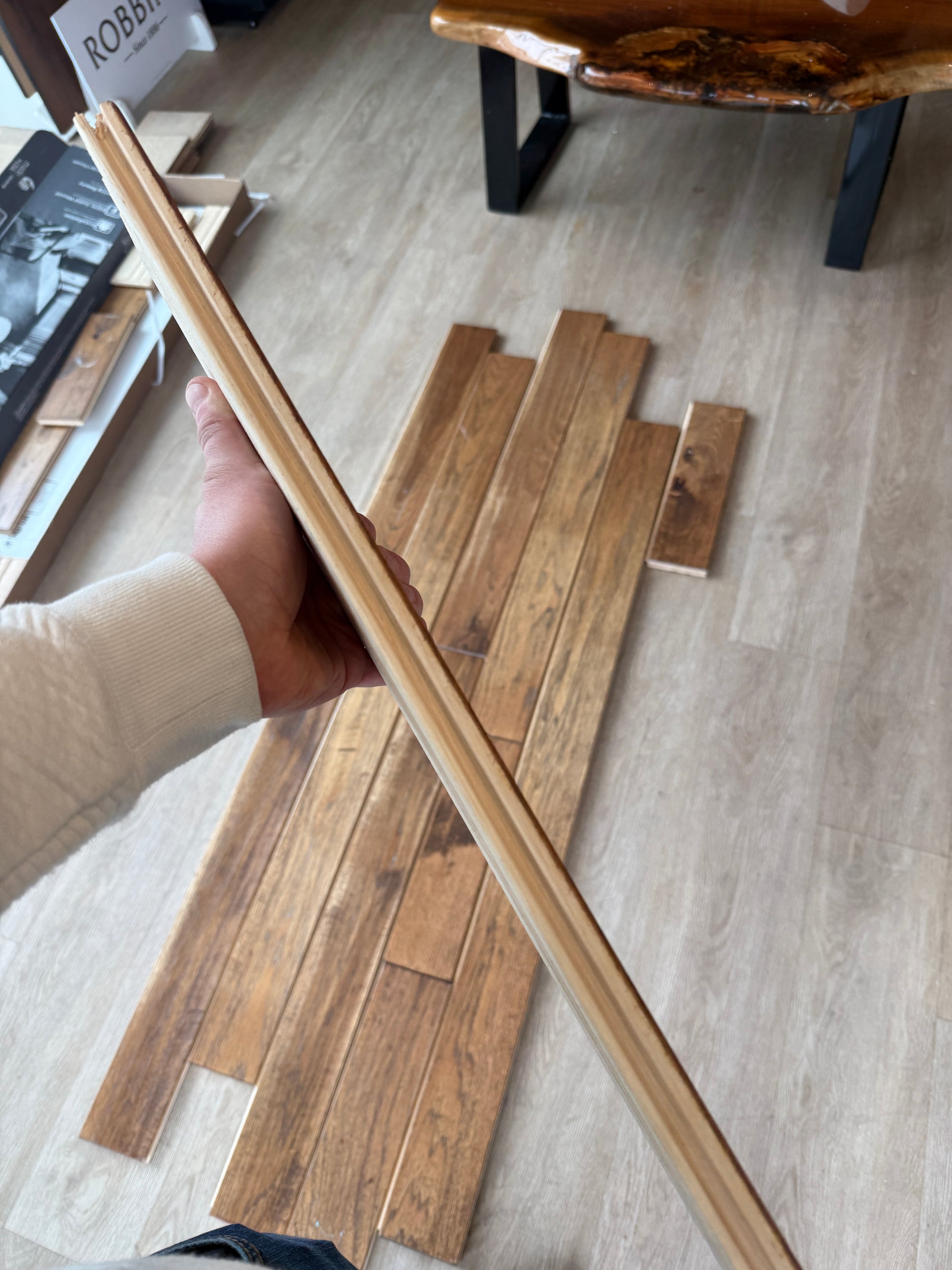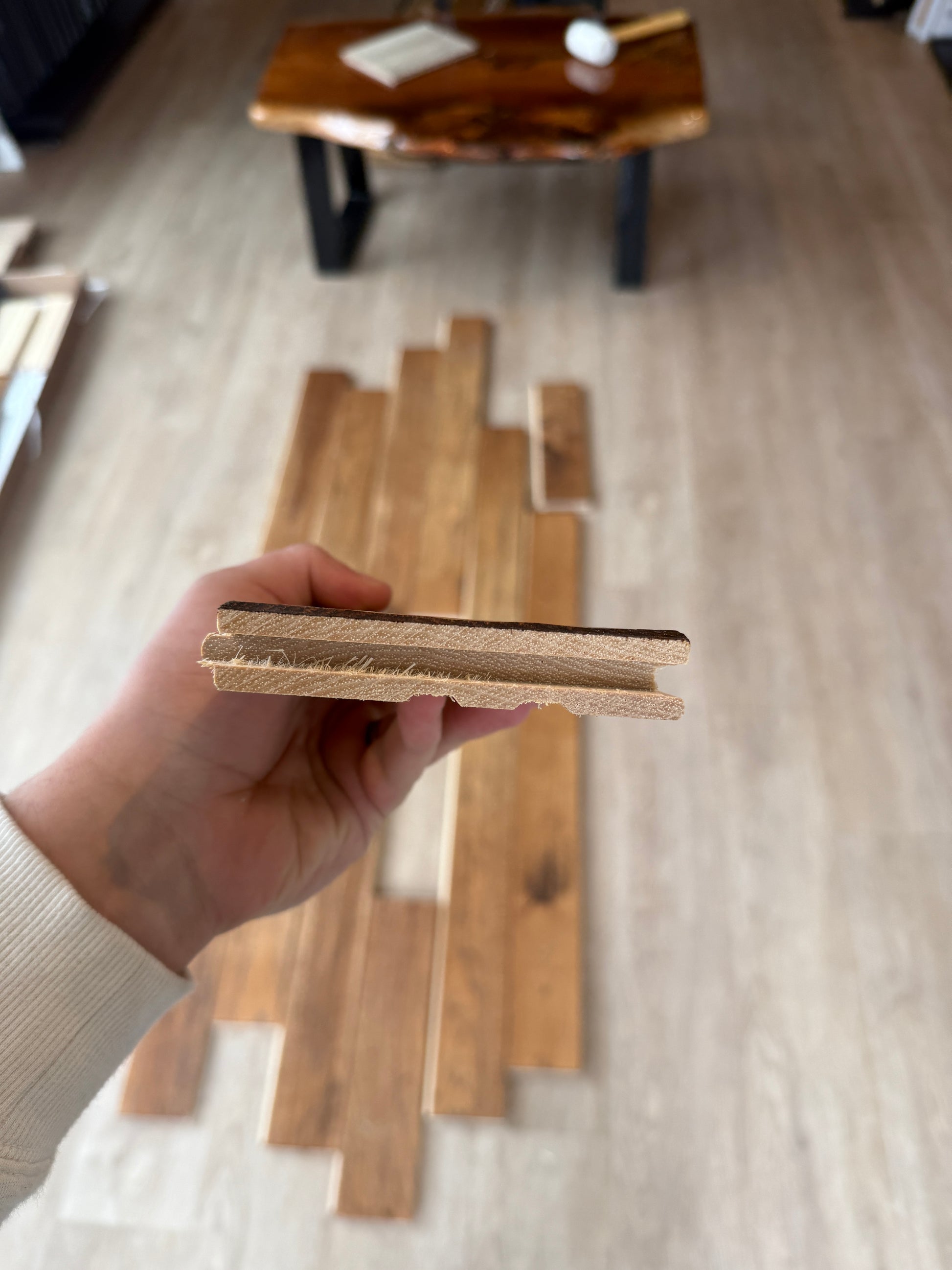 This item is a prefinished cabin grade product that will have open knots, light and dark wood, minor imperfections, wormholes, mineral streaks, chalk marks and will have a shorter average length than the premium grade. In our experience approximately half of the material could be under 30” long. This B-grade product is more than half the price of the premium grade and it's a great value. We recommend ordering at least 10% cutting waste and expect to have a more rustic-looking floor. The pictures we provided were taken from an actual box of material from our inventory. Because of the grade of this product all sales are final and there are no returns.